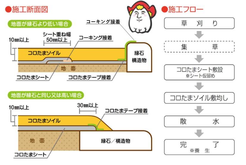 「かまださんのコロンブスのたまご」は、コロたまシートとコロたまソイルを現場で重ね合わせる複合一体型防草材です。